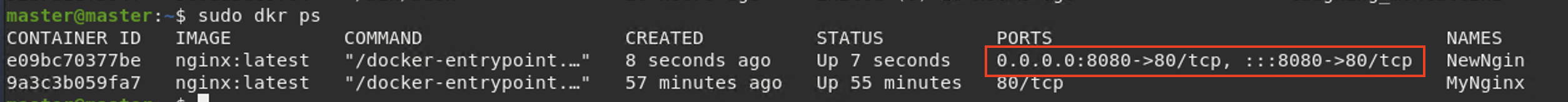"sudo docker run -p 8080:80 -d --name "NewNgin" nginx:latest" 명령으로