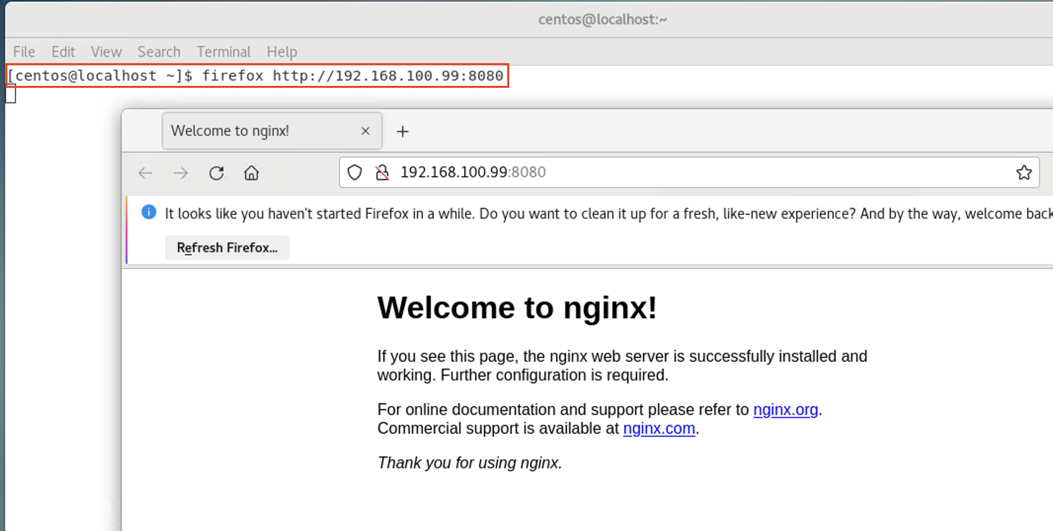 별도의 가상 머신(CentOS7)에서 "firefox http://192.168.100.99(Ubunser의 주소):8080" 를