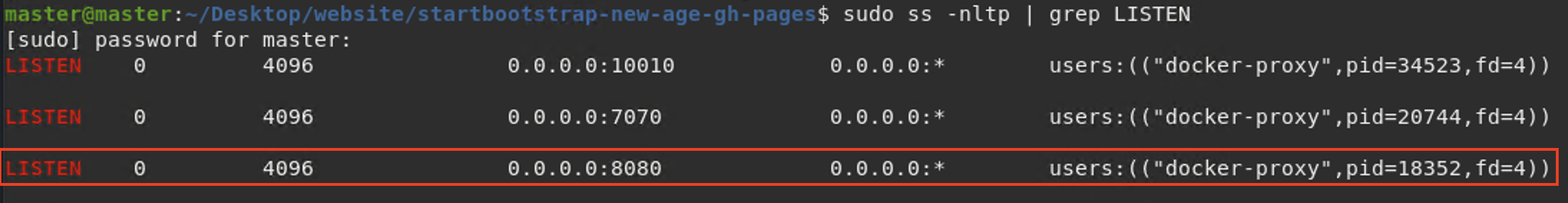 "sudo ss -nltp | grep LISTEN" 명령어를 이용하여 도커 컨테이너(프로세스) 생성 시 지정한 포트가