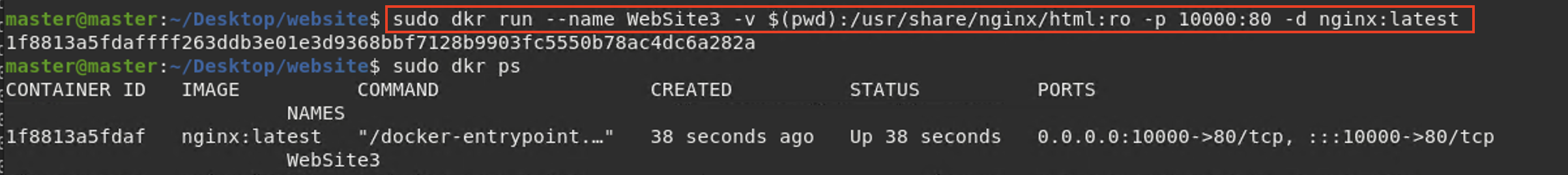 sudo docker run --name [ContainerName] -v ${pwd}:/usr/share/nginx/html:ro -p 10000:80 -d nginx:latest