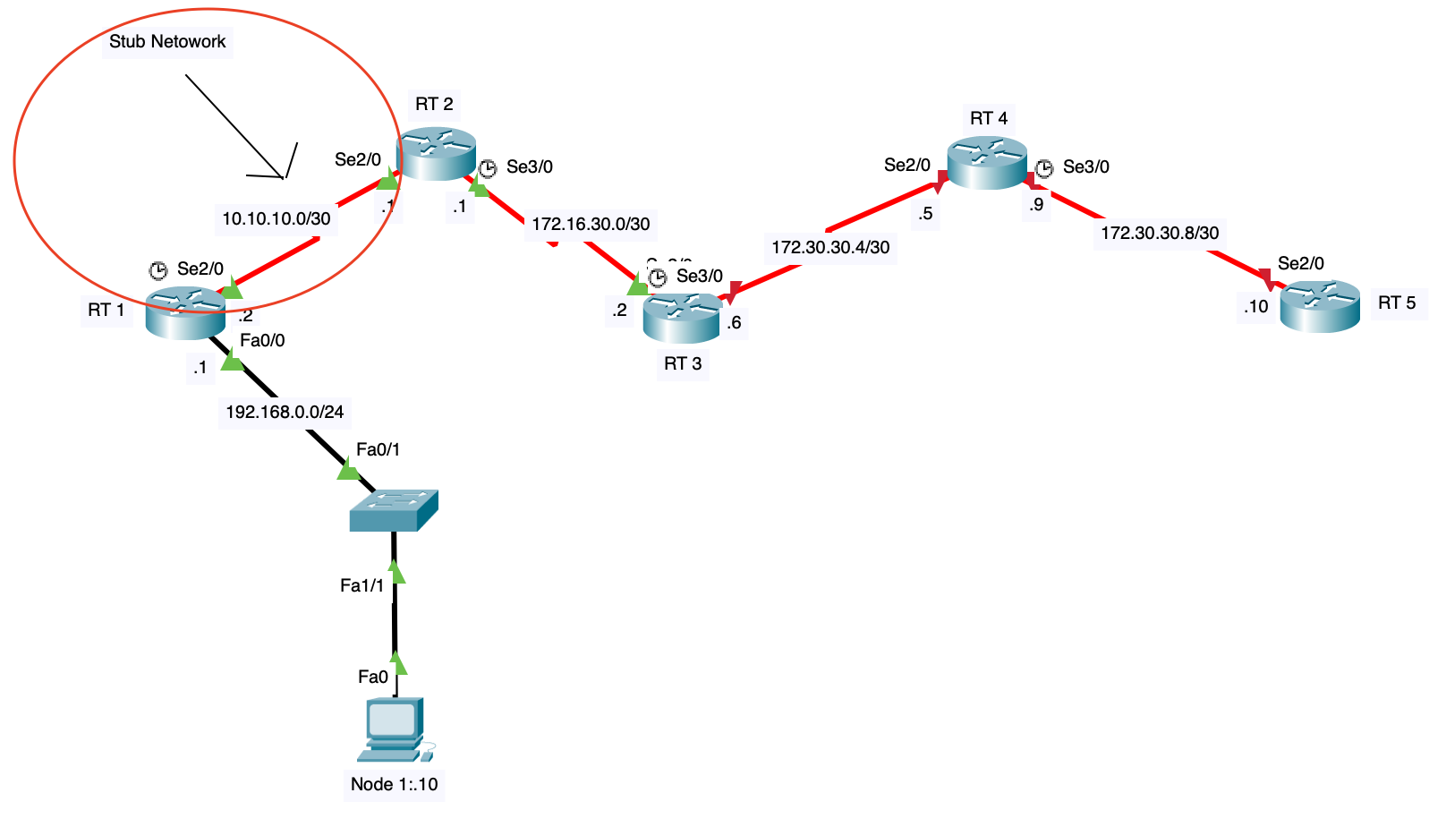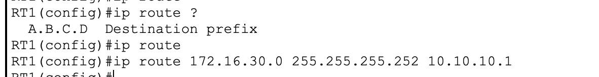 RT1 (config) #ip route 172.16.30.0 255.255.255.252 10.10.10.1